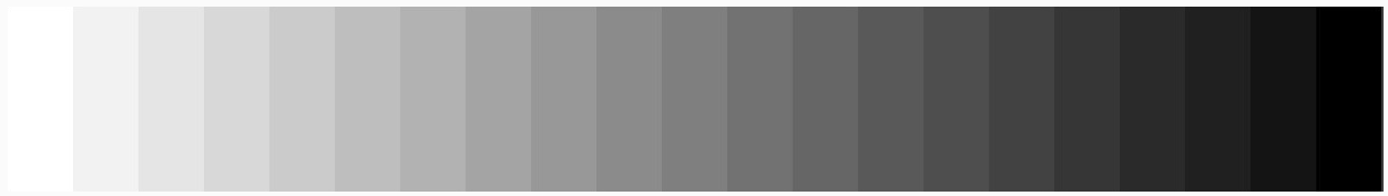 | Mit Hilfe der Gammakorrektur werden Unterschiede im Dynamikumfang unterschiedlicher Ausgabegeräte ausgeglichen. Der Gammawert 1 entspricht dem perfekten Bildschirm, der den Übergang von Weiss über Grau bis Schwarz vollkommen linear reproduziert. Leider gibt es solche Bildschirme nicht, alle Computerbildschirme weichen mehr oder weniger davon ab. Für eine optimale Darstellung sollte das Gamma des Monitors daher so eingestellt werden, dass auf dem unten abgebildeten Graustufenkeil alle Abstufungen von weiss bis schwarz sichtbar sind. |